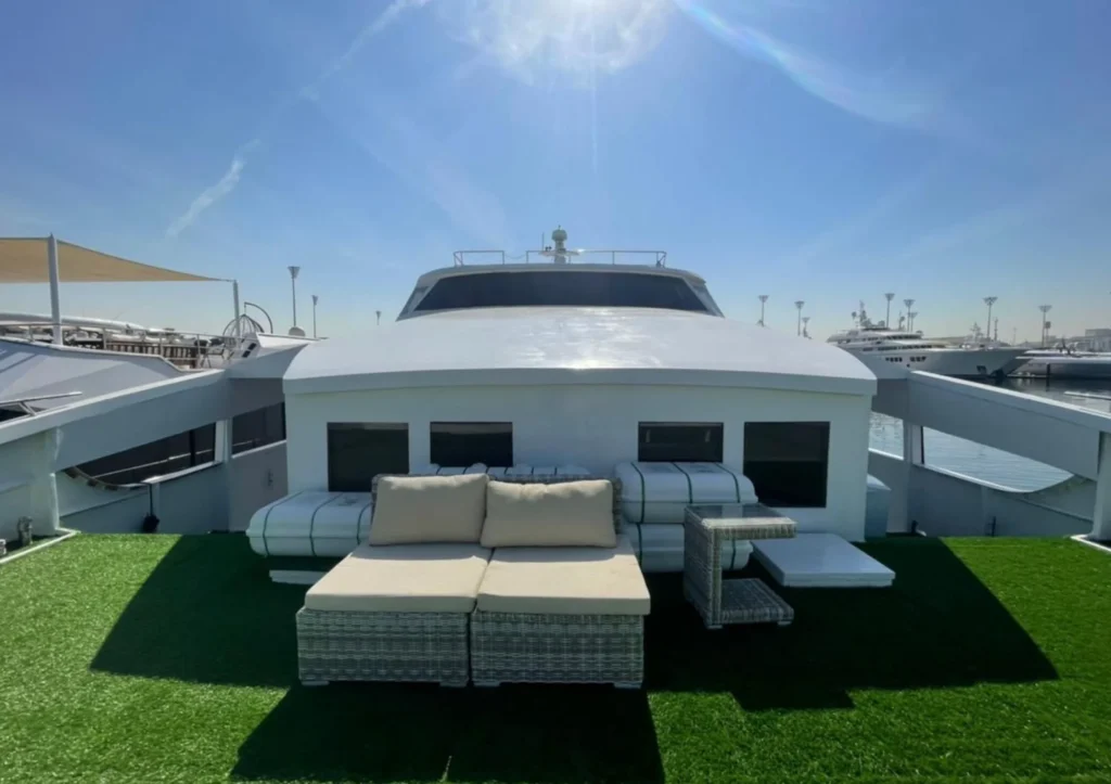 The 100ft Dubai yacht tour is perfect for large groups, parties, and luxury cruising. With spacious decks, modern interiors, and smooth sailing, this yacht gives you a premium experience while exploring Dubai Marina, Palm Jumeirah, and JBR.